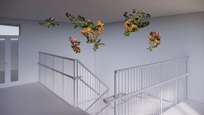 På övre plan i skolbyggnadens trapphus installerar Anja Fredell ett flertal handtuftade textila verk, inspirerade av växtlighet som trotsar hinder och finner sin väg. Här får dessutom eleverna delta i skapandeprocessen genom att tillsammans med konstnären färga verkens garn, med hjälp av björklöv och nässlor från Dalängsskogen.