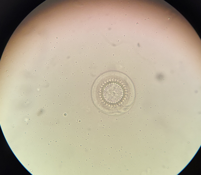 På bilden syns en hudparasit (Trichodina) som levde på en fisk, sett under mikroskop.