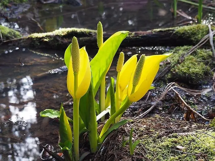 Kännetecken: Storvuxen växt med meterhöga blad och gult hölsterblad som omsluter en stor grön blomkolv. Växten luktar illa och bildar täta bestånd.